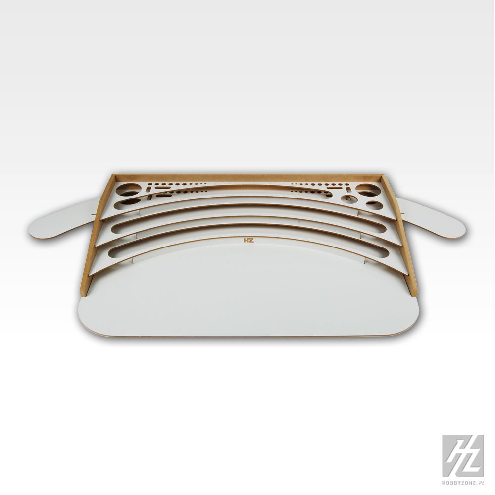 Stolik do malowania składa się z podstawki o wymiarach 60 cm x 40 cm x 8 cm, posiada aż trzy rzędy na umieszczenie farbek których powinno zmieścić się nawet 50 szt, kilkanaście otworów na pędzelki, pilniki, nożyki, kleje itp, dwa uchwyty na kubki z wodą, wysunięty blat zapobiegnie zabrudzeniom miejsca w którym malujesz.